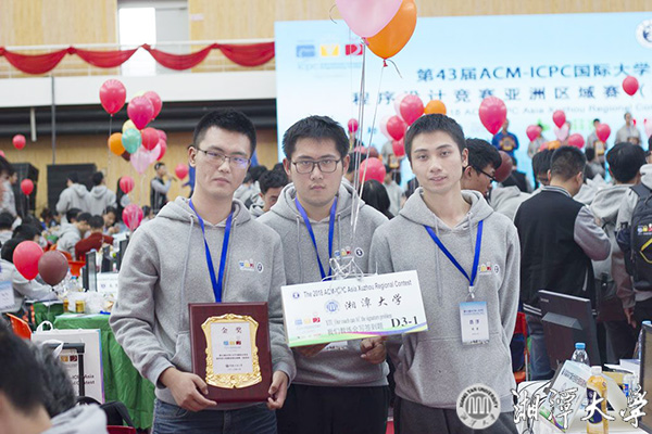 信息工程學院謝勇老師指導的“我們教練會寫簽到題”隊,由信息工程學院2015級網絡工程專業斯海洋、2015級軟件工程專業程堅、數學與計算科學學院2015級韶峰班郭晨亮組成。比賽過程中,3位隊員團結合作,敢打敢拼,在前期罰時不利的情況下,后期發力,比賽封板后連過2題,最終以隊伍排名第16的成績勇奪金獎。